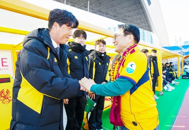 강기정 광주광역시장이 7일 오후 광주월드컵경기장에서 열린 광주FC와 인천 유나이티드의 2026시즌 K리그1 홈 개막전에 참석해 광주FC 이정규 감독을 격려하고 있다./광주광역시 제공