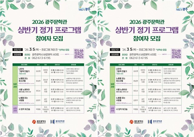 [위키트리 광주전남취재본부 노해섭 기자]광주광역시(시장 강기정)는 시민의 문학적 감수성과 창작 역량을 키우기 위해 ‘2026년 광주문학관 상반기 정기 프로그램’을 운영한다.