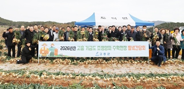 [위키트리 광주전남취재본부 노해섭 기자]고흥군(군수 공영민)은 조생양파 수확기를 맞아 지난 5일 금산면 대흥리 일원 양파 재배단지에서 ‘2026년산 양파 수확 현장 들녘간담회’를 개최하고 양파 재배 농가의 애로사항을 청취하는 현장 소통의 시간을 가졌다.