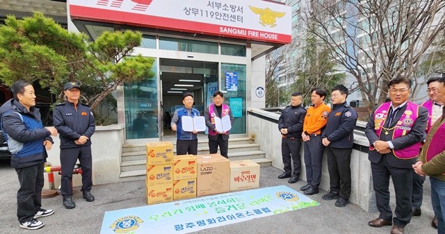전국공무원노동조합 광주소방지부와 광주평화라이온스클럽은 9일 광주 서부소방서 상무119안전센터에서 ‘사회공헌 협력 및 정기 물품봉사를 위한 업무협약(MOU)’을 체결했다.