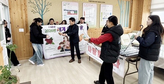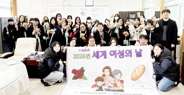 봄기운이 완연한 지난 6일, 전남 함평여자중학교 교장실에 향긋한 장미꽃 향기와 고소한 빵 냄새가 번졌다. 다가오는 ‘제118주년 세계 여성의 날(3월 8일)’을 앞두고, 지역 어른들이 여중생들의 건강한 성장과 밝은 미래를 응원하기 위해 두 손 무겁게 학교를 찾은 것이다.
