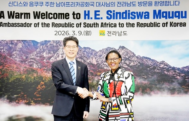[위키트리 광주전남취재본부 노해섭 기자]황기연 전라남도 행정부지사가 9일 오후 전남도청을 내방한 신디스와 음쿠쿠 주한 남아공 대사와 교류협력 증진을 위한 논의를 마치고 기념촬영을 하고 있다.