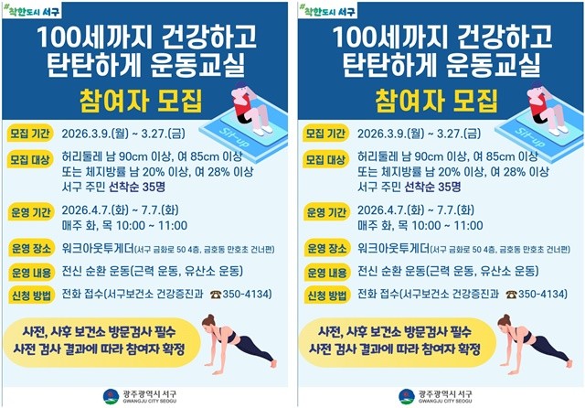 한편 서구는 지난해 하반기 주민 35명을 대상으로 ‘100세까지 건강하고 탄탄하게 운동교실’을 운영했으며 사후 검사 참여자 중 67.7%(21명)의 체지방률이 감소하는 성과를 거두며 큰 호응을 얻었다.
