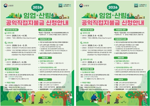 한편, 기본형 공익직불제는 농업·농촌의 공익적 기능을 증진하고 농업인의 소득 안정을 도모하기 위해 시행하는 제도로, 군은 읍·면을 통한 현장 안내와 홍보를 지속적으로 추진할 계획이다.