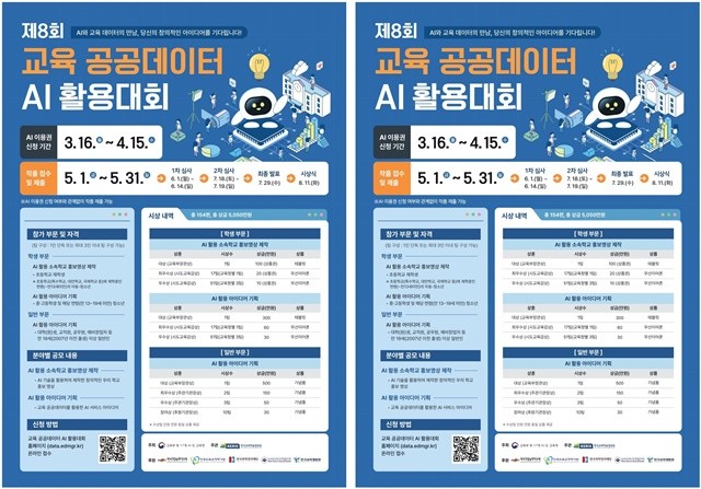 AI 이용권 신청은 오는 16일부터 다음달 15일까지, 작품 제출은 5월 1일부터 5월 31일까지 교육 공공데이터 분석활용대회 누리집을 통해 하면 된다.