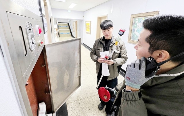 [위키트리 광주전남취재본부 노해섭 기자] 12일 광주시 북구청 공공청사과 직원과 민간전문가들이 화재 발생 시 안전사고에 대비하기 위해 청사 내 소화전과 소방장비 등의 작동 유무와 안전점검을 실시하고 있다.