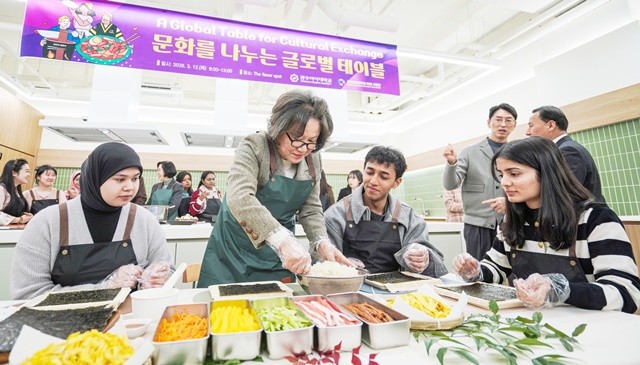 개소식 이후에는 ‘글로벌 테이블(Global Table)’ 프로그램이 진행됐다. 프로그램에서는 한국 음식과 문화를 소개하고 총장과 유학생들이 함께 김밥 만들기 체험을 진행하며 서로의 문화를 공유하는 교류 프로그램이 운영됐다. 학생들은 음식을 매개로 자연스럽게 대화를 나누며 다양한 문화적 경험을 공유하는 시간을 가졌다.