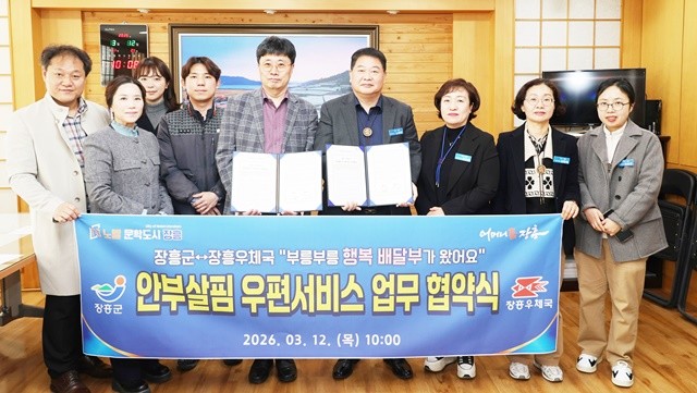장흥군(군수 김성)은 15일 “지난 12일 장흥우체국과 취약계층의 안부를 살피고 복지 사각지대를 없애기 위한 ‘안부살핌 우편서비스 사업’ 업무협약을 맺었다”고 훈훈한 소식을 전했다.