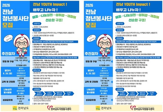 청년봉사단 모집과 관련한 자세한 사항은 강진군청 주민복지과 희망복지팀으로 문의하면 된다.