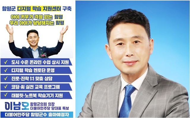 이남오 더불어민주당 함평군수 출마 예정자(현 함평군의회 의장)는 15일 “지난 12일, 자녀 교육을 위해 고향을 떠나는 일이 없도록 ‘함평-광주 공동학군제’와 ‘디지털 학습 지원센터’를 만들겠다는 핵심 공약을 발표했다”고 밝혔다.