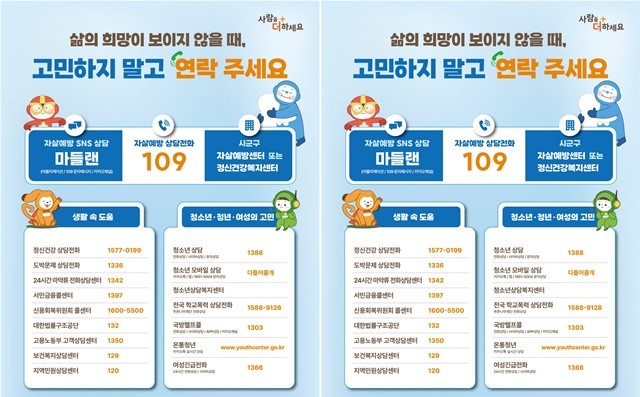 이와 함께 생명존중 문화 확산을 위해 시군과 연계한 생명존중 캠페인과 홍보물 배포, 온라인 홍보 등을 추진하고, 학교와 공공기관, 지역단체와 협력해 자살예방 교육과 홍보 활동을 확대할 계획이다.