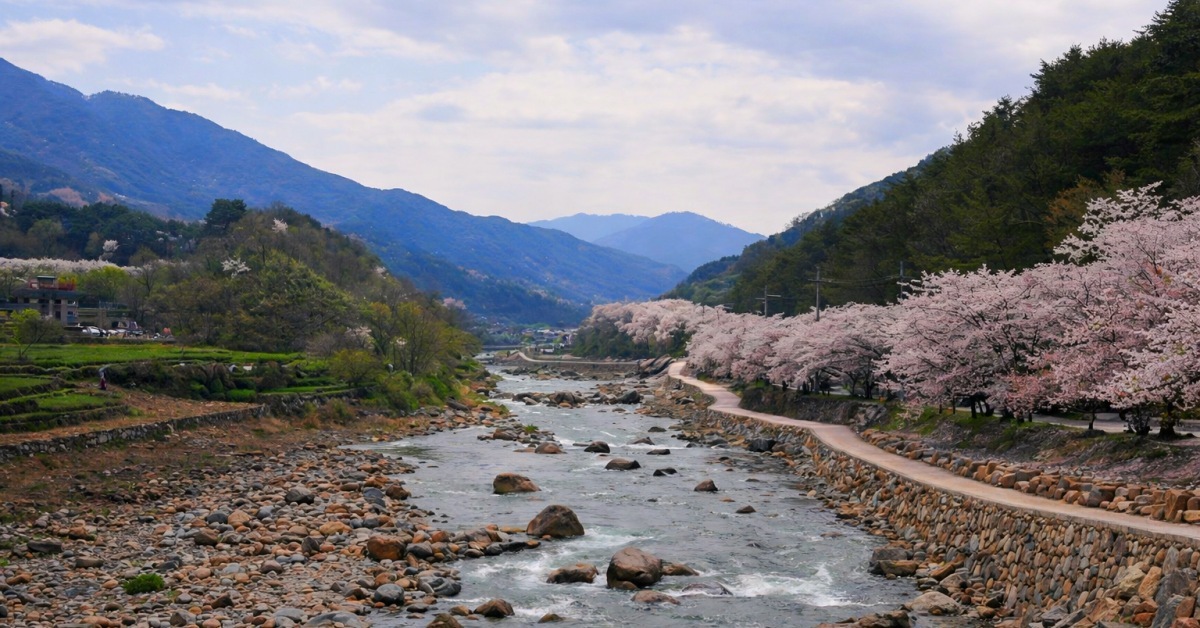 엉덩물계곡이 가장 빛나는 시기는 단연 봄이다. 일반적인 유채꽃밭이 평지에 펼쳐진 '노란 바다'라면, 이곳은 계곡의 경사면을 따라 꽃이 층층이 피어난다. 마치 노란 꽃으로 만든 파도가 치는 듯한 입체적인 장관을 만날 수 있다.