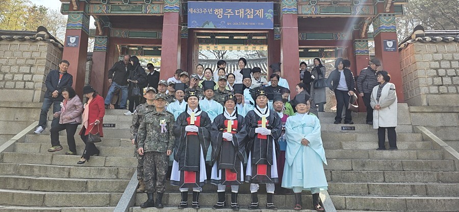 이날 행사는 △행사 안내 △개식 △국민의례 △행주대첩제 봉행(전향례, 초헌례, 아헌례, 종헌례, 음복례, 망료례) △분향 및 기념 촬영 순으로 약 1시간 동안 이어졌으며, 제례악 연주가 더해져 장엄한 분위기 속에 진행됐다.