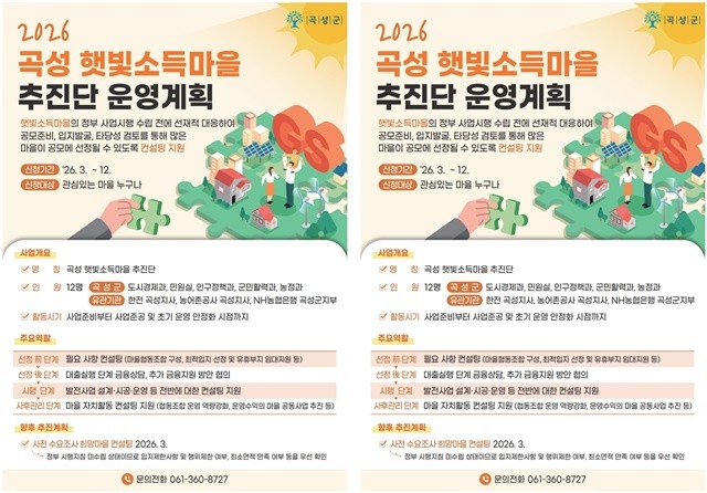 곡성군 관계자는 “햇빛소득마을 추진단을 중심으로 행정과 유관기관이 협력해 마을별 맞춤형 지원체계를 구축해 나가겠다”라며 “사전 컨설팅을 통해 사업 추진 가능성을 꼼꼼히 검토하고 더 많은 마을이 공모사업에 참여할 수 있도록 적극 지원하겠다”라고 말했다.