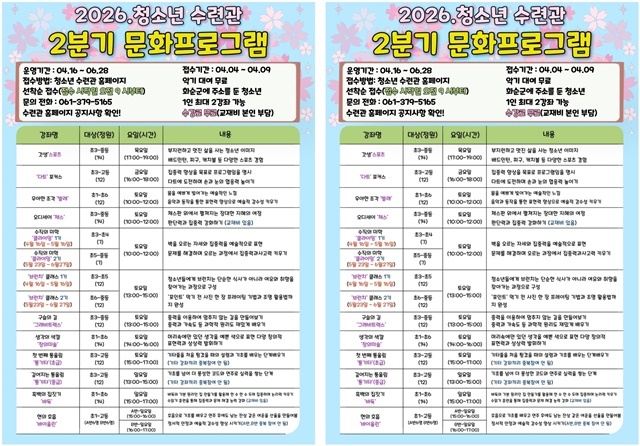 전남 화순군, 미래 세대 ‘건강한 여가 인프라’ 팍팍 키운다~청소년수련관 2분기 맞춤형 12개 강좌 가동