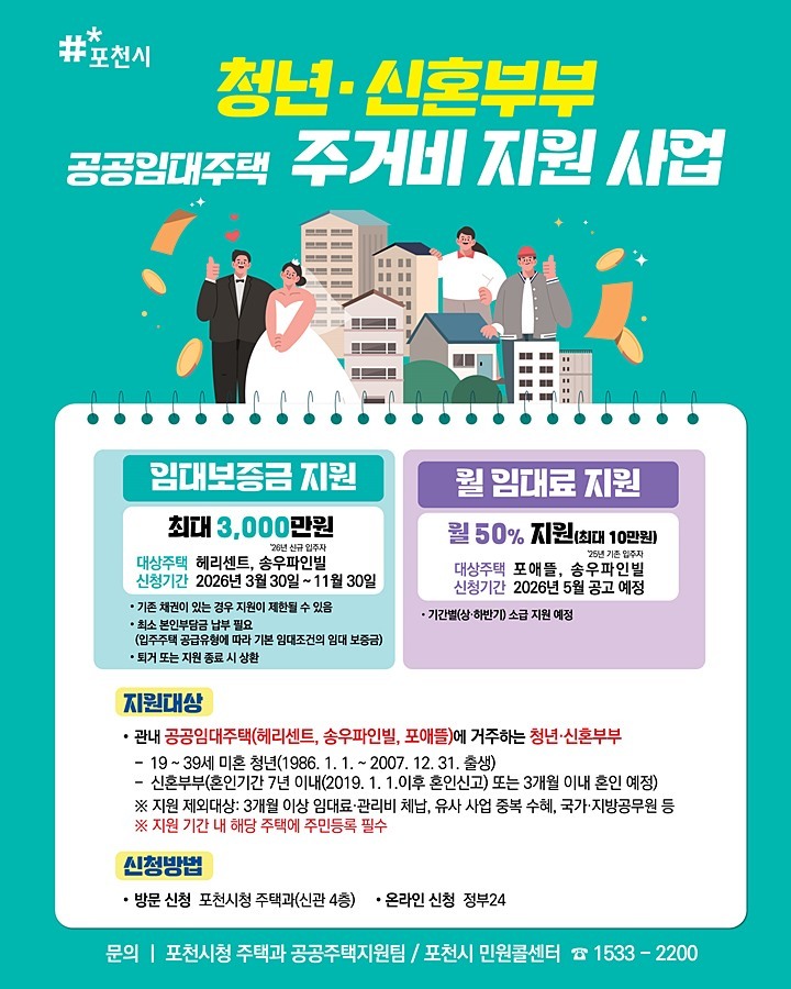 포천시 관계자는 “이번 사업이 신혼부부와 다자녀가구, 청년가구의 실질적인 주거비 부담을 덜고 지역 정착에 도움이 되길 바란다”며 “앞으로도 체감도 높은 주거복지 지원을 지속적으로 추진하겠다”고 말했다.