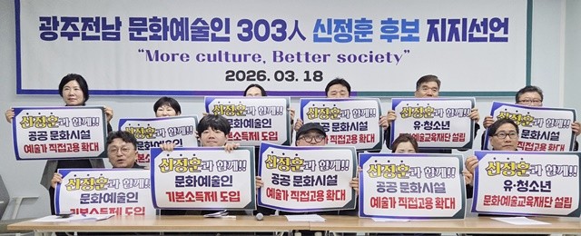 광주·전남 문화예술인 303명은 18일 오후 2시 광주광역시의회 시민소통실에서 기자회견을 열고 “신정훈 후보가 가진 문화예술 관련 공약이 가장 실효성 있다”며 공개 지지를 선언했다.