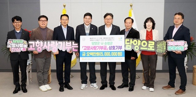 [위키트리 광주전남취재본부 노해섭 기자]담양군은 지난 18일 담양군청에서 담양군과 순창군 농협 군지부 지부장 및 조합장이 참석한 가운데 ‘담양군-순창군 고향사랑기부금 상호기부 기탁식’을 개최했다고 밝혔다.
