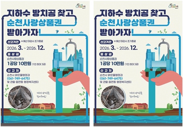 신고 대상은 장기간 미사용 상태로 방치된 지하수 관정으로, 방치공 위치와 현장 사진 등 확인 가능한 자료를 첨부해 순천시 맑은물행정과 또는 관할 읍면동 행정복지센터(온라인·전화·방문 등)를 통해 신고하면 된다.