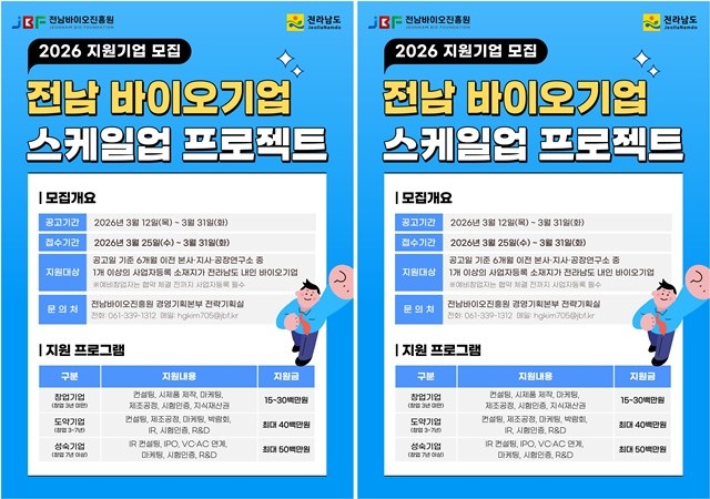 김기홍 전남도 전략산업국장은 “전남은 천연물과 해양생물 등 풍부한 바이오 소재와 화순백신산업특구, 전남바이오진흥원, 화순전남대병원 등 연구·임상 인프라를 갖춘 바이오산업 최적지”라며 “이번 스케일업 프로젝트를 통해 유망 바이오기업을 체계적으로 육성해 전남을 바이오산업의 핵심 성장거점으로 만들겠다”고 말했다.