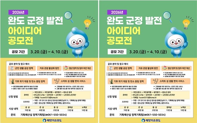 군 관계자는 “군민의 작은 아이디어 하나가 지역의 큰 변화를 이끌 수 있다”며 “많은 관심과 참여를 통해 함께 완도의 미래를 만들어가길 기대한다”고 밝혔다.