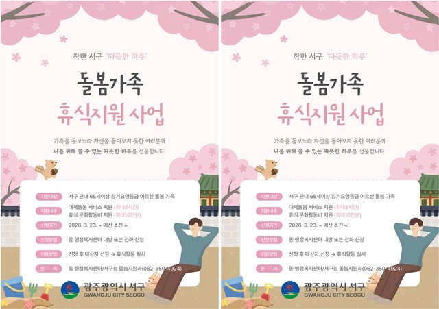 서구는 20일 “가족 돌봄으로 지친 주민의 부담을 덜고 지속 가능한 돌봄 환경을 만들기 위해 ‘돌봄가족 휴식지원사업’을 시행한다”고 밝혔다. 이번 사업은 돌봄자의 신체적·정서적 소진을 예방하고 안정적 돌봄체계를 구축하는 데 초점을 맞췄다.