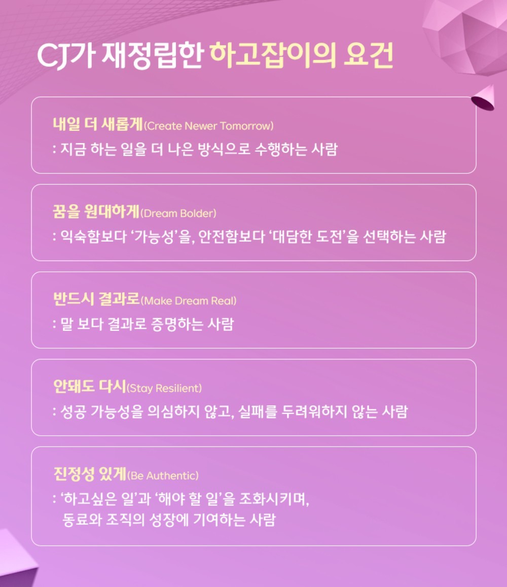 CJ그룹의 인재 철학은 일하는 문화에서 더 선명하게 드러난다. 대표적으로 ‘하고잡이’라는 인재상이 있다. 이는 현재에 머무르지 않고 더 나은 방법을 찾으며, 익숙함보다 가능성을 선택해 스스로의 길을 만들어가는 사람을 의미한다.