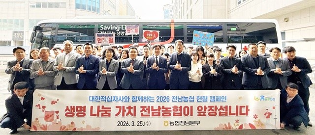 26일 농협계에 따르면, 농협중앙회 전남본부(본부장 이광일)와 전국금융산업노조 NH농협지부 전남지역본부(위원장 차상훈)는 지난 25일 전남본부 청사 일대에서 대대적인 범농협 임직원 헌혈 행사를 전개했다. 사측과 노조가 이견 없이 한목소리로 추진한 이번 뜻깊은 행사에는 바쁜 업무 일정 속에서도 약 50명의 직원이 자발적으로 소매를 걷고 헌혈 버스에 오르며 따뜻한 동료애와 인류애를 동시에 실천했다.