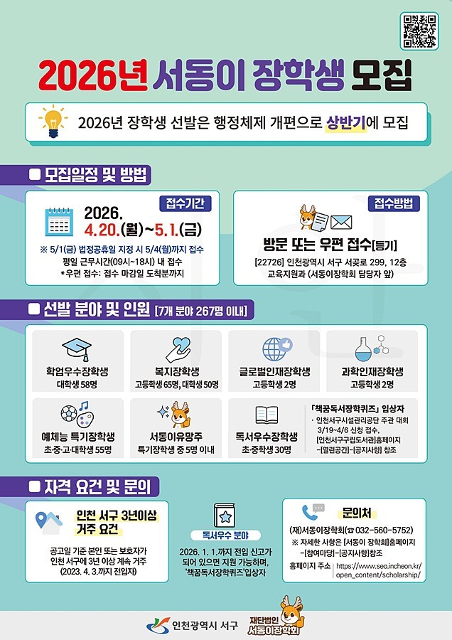 인천 서구 재단법인 서동이장학회(이사장: 강범석 서구청장)는 지역 인재 양성을 위한 ‘2026년도 서동이 장학생’을 상반기에 모집한다.