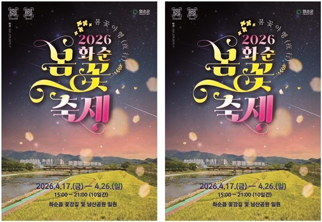 26일 화순군에 따르면, 오는 4월 17일부터 26일까지 화순읍 꽃강길 일원(벽라교~삼천교 2.1km 구간, 약 6ha)에서 ‘2026 화순 봄꽃 축제’가 개최된다. ‘봄꽃야행’을 주제로 열리는 이번 축제에는 총 500만 주의 꽃과 20종의 다채로운 조형물이 설치돼 낮과 밤이 각기 다른 매력을 선사할 예정이다. 대규모 유채꽃을 비롯해 오스테오스펄멈, 금어초, 크리산세멈, 리나리아, 팬지 등 20여 종의 초화류 30만 본이 화려한 색채를 뽐낸다.