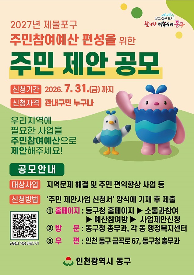 인천 동구(구청장 김찬진)는‘2027년 주민참여예산’제안 사업 공모를 오는 7월까지 진행한다고 밝혔다.