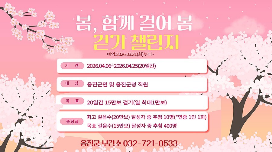 인천 옹진군(군수 문경복)은 군민의 일상 속 걷기 실천을 유도하고 비만 예방 및 건강생활 실천 분위기 조성을 위해 4월 6일부터 25일까지 운영되는 「봄, 함께 걸어 봄 걷기」챌린지 참가자를 3월 31일(화)부터 모집한다고 밝혔다.