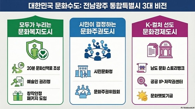아울러 문화가 산업과 일자리로 이어지는 '문화경제도시'를 추진한다. '남도 원형문화 인공지능(AI) 대전환 전략'을 통해 지역의 언어, 생활문화, 자연유산 등을 데이터화하고, 이를 콘텐츠 산업과 연결해 새로운 문화 일자리를 창출하는 방안이다. 이를 뒷받침하기 위해 스토리뱅크, 공공 IP센터를 건립하고 ‘문화햇빛기금’과 ‘로컬 IP 펀드’를 조성해 문화 산업의 돈줄 역할을 할 금융 생태계도 마련한다.