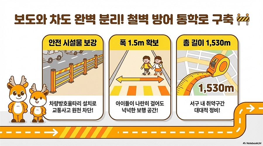 보도와 차도가 분리되지 않아 사고 위험에 노출되었던 석남초, 신현북초, 검암초, 가좌초 등 4개교 주변 총 1,530m 구간에 폭 1.5m의 전용 보행로를 신설한다.