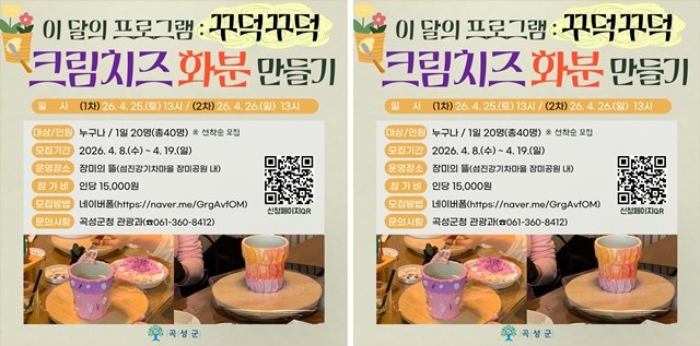 곡성군은 오는 25일과 26일 양일간 섬진강기차마을 내 위치한 '장미의 뜰'에서 관광객들을 위한 ‘꾸덕꾸덕 크림치즈 화분 만들기’ 프로그램을 선보인다고 밝혔다. 이번 행사는 봄 시즌을 맞아 지역을 찾은 상춘객들에게 색다른 감성 체험을 제공하기 위해 기획된 참여형 원데이 클래스다.