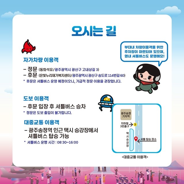 지난해 1만 1천 명이 넘는 구름 인파가 몰린 만큼, 올해는 더욱 쾌적한 관람을 위한 동선과 편의 시스템이 마련됐다. 당일 오전 8시 30분부터 부대 출입이 가능하며, 대중교통 이용객을 위해 광주송정역 3번 출구 인근에서 행사장까지 직행하는 셔틀버스가 쉼 없이 운행된다. 특히 최고 인기 프로그램인 고무동력기 및 폼보드 전동 비행기 날리기 체험은 각 100명씩 선착순으로 진행되므로, 4월 20일 오후 1시 공식 홈페이지를 통한 발 빠른 사전 예약이 필수다.