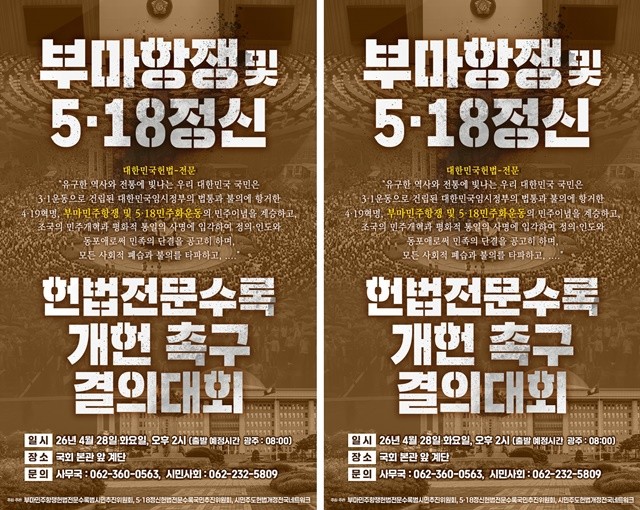[위키트리 광주전남취재본부 노해섭 기자]광주광역시는 오는 28일 오후 2시 국회 본관 앞에서 정치권의 개헌 결단을 촉구하는 ‘부마항쟁 및 5·18정신 헌법 전문 수록 개헌 촉구 국민결의대회’가 대대적으로 열린다고 밝혔다. 이번 대회는 5·18정신헌법전문수록국민추진위원회 등 3개 시민단체가 공동으로 주최·주관하여 민주화 운동 정신의 헌법적 가치 격상을 요구한다.