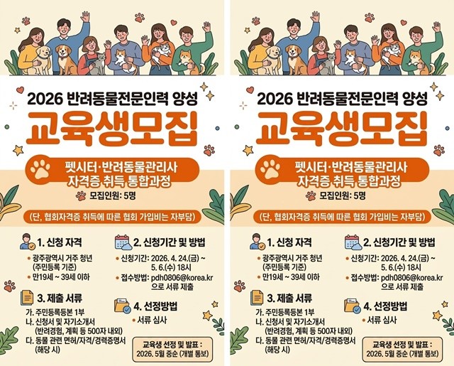 [위키트리 광주전남취재본부 노해섭 기자] 광주광역시가 쑥쑥 크는 반려동물 산업에 발맞춰 현장에서 활약할 전문인력 육성에 팔을 걷어붙였다. 시는 늘어나는 반려동물 돌봄 수요에 선제적으로 대응하고 성숙한 반려 문화를 이끌기 위해 ‘2026년 반려동물 전문인력 양성교육’을 실시한다고 밝혔다.