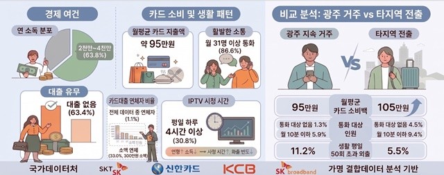 이번 보고서는 국가데이터처의 공공데이터와 SK텔레콤, 신한카드, 코리아크레딧뷰로(KCB), SK브로드밴드 등 민간 데이터를 가명 결합하여 개인 식별 없이 안전하게 분석한 결과다. 시는 지난 2025년 3월 기준 광주 거주 1인 가구(5만 2,950명)와 타지역 전출 1인 가구(1만 2,086명)의 데이터를 비교해 정교한 맞춤형 정책 수립의 기초 자료를 마련했다.