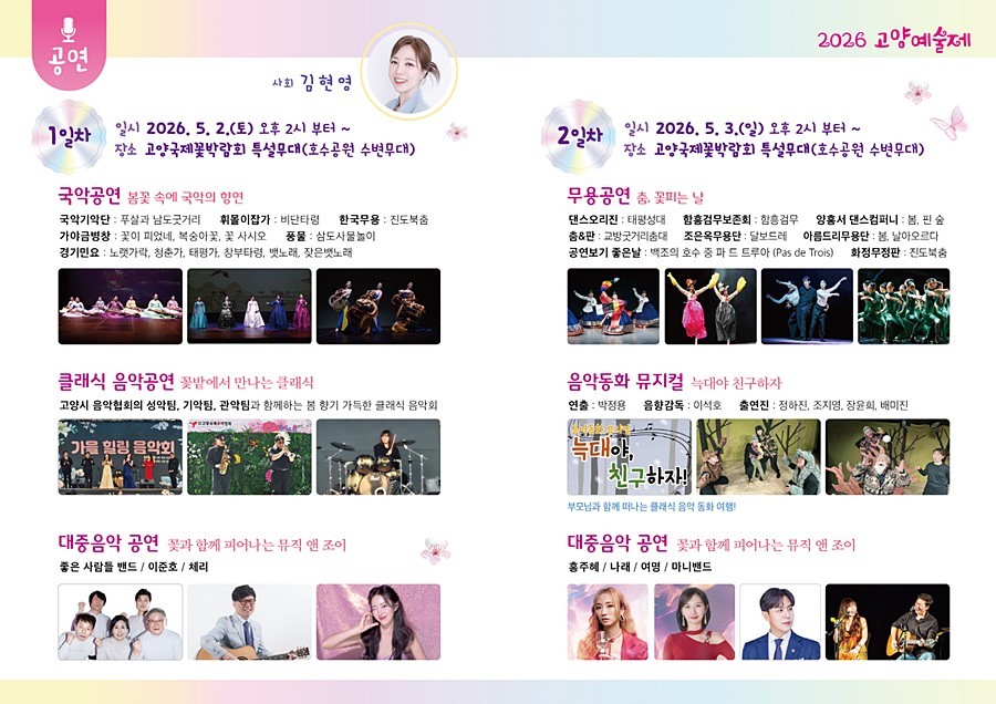 (사)고양예총이 주관하는 이번 예술제는 ‘2026 고양국제꽃박람회’와 연계하여 오는 5월 3일까지 수변무대와 야외 전시부스에서 다채롭게 펼쳐진다.