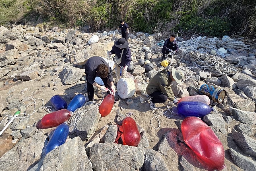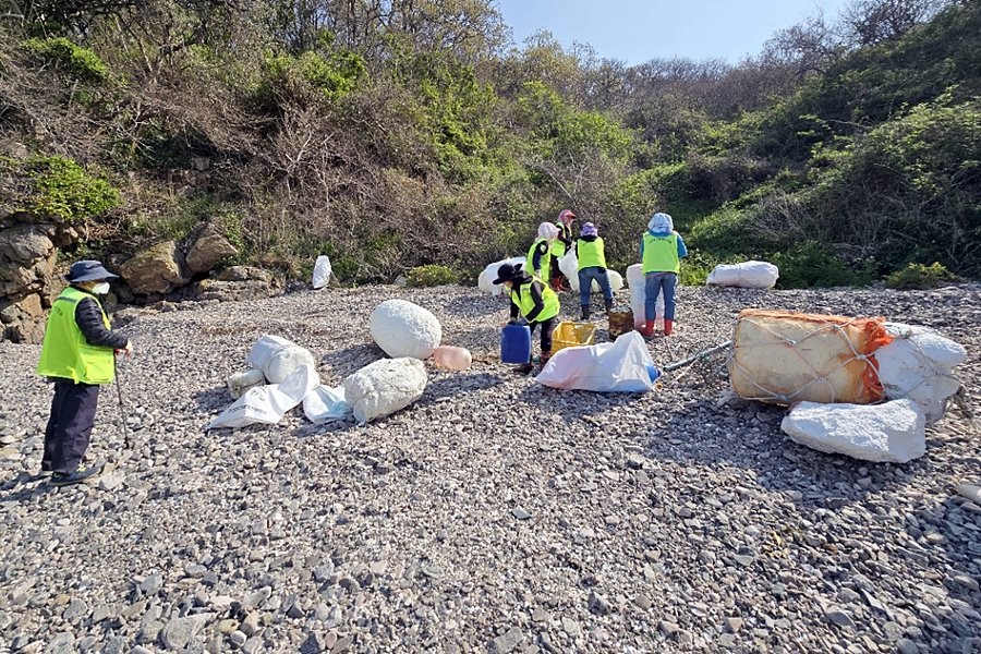 이들은 접근이 어려운 갯바위와 해변 곳곳으로 밀려든 폐스티로폼, 폐부표, 플라스틱 등 해양 쓰레기 약 3톤을 수거해 집하장으로 운반하며 구슬땀을 흘렸다.