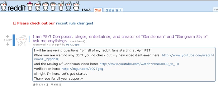 국제가수 싸이(@psy_oppa)가 16일 팬들과 소셜사이트 '레딧'(Reddit)에서 대화를 나눴습니다.