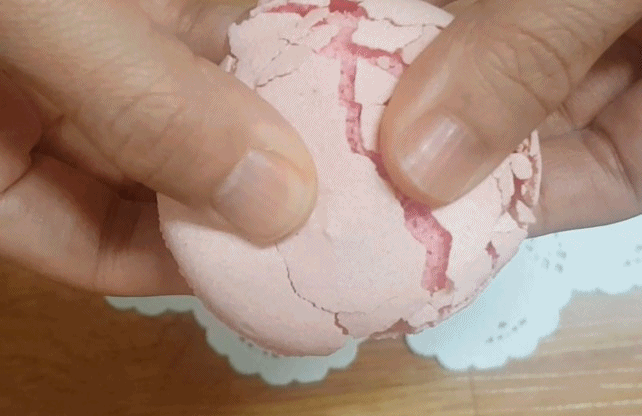 일단 예쁘다. 파스텔톤의 분홍빛이 여느 마카롱처럼 곱다. 이 고운 마카롱이 밀웜으로 만들어졌다니 믿기지 않는다. 반으로 쪼갤 때 작아서 그런지 잘 부서졌다.