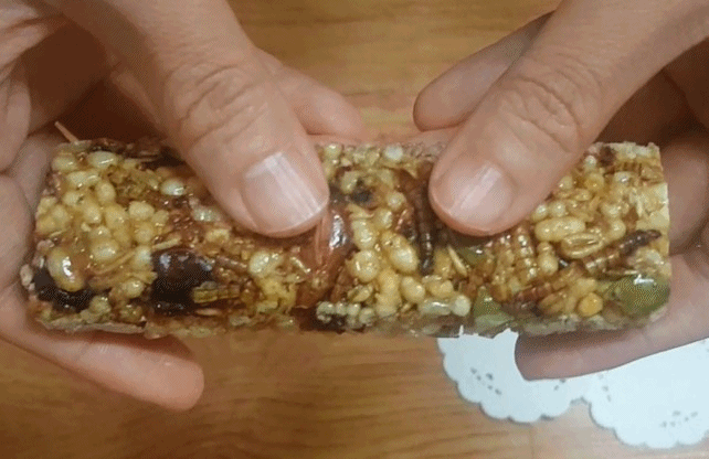 밀웜이 그대로 박혀 있는 에너지바다. 견과류를 넣어 강정처럼 만들었다.