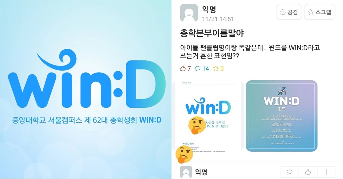 김재환 공식 팬클럽명 WIN:D와 중앙대학교 62대 총학생회의 로고 유사성 관련하여 말씀드립니다.