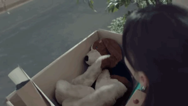 이때 반전이 나타난다. 상자 속 인형은 사실 살아있는 진짜 강아지였던 것이다. 반려견을 인형처럼 취급하며 너무 쉽게 사고 버린다는 메시지 드러나는 부분이다.