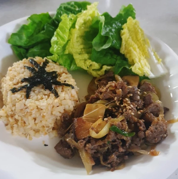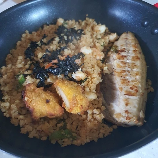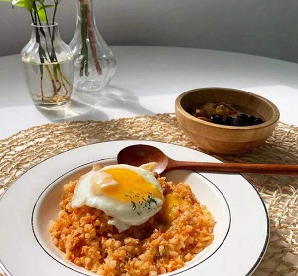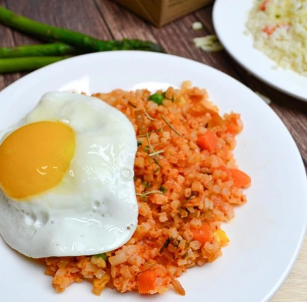 컬리플라워라이스를 2배 맛있게 즐길 수 있는 식단 사진이다. 볶아서 먹으면 포슬포슬한 식감과 깔끔한 맛을 느낄 수 있다.