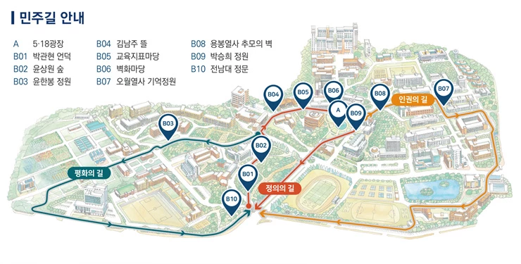 전남대 민주길은 83억여 원의 사업비를 들여 학내 민주화운동 기념공간 11곳을 3개 노선, 5㎞로 잇는 일종의 둘레길로, 지난 2018년 시작돼 예산확보의 어려움을 극복하고 마침내 이날 준공에 이르게 됐다.