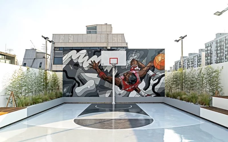 4층 루프탑에는 마이클 조던의 덩크 장면의 에너지를 강렬한 컬러와 기하학적인 도형으로 구현한 국내 아티스트 ‘알타임 조(Artime Joe)’의 ‘Jump On’으로 완성된 농구 코트가 세워져 루프탑에서 즐기는 색다른 경험을 선보인다.