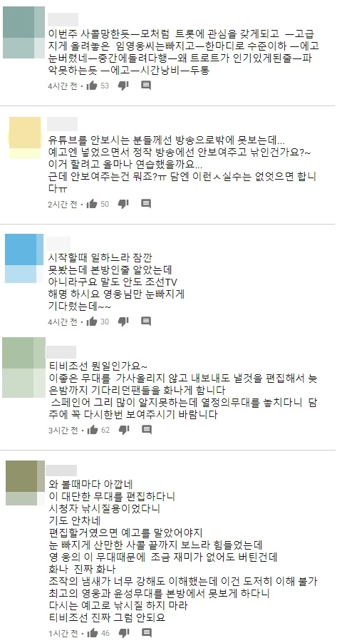 임영웅 씨 등 팬들은 "시청률 뽑아먹으려고 안간 힘이다", "예고편 보고 목 빠지게 기다렸는데", "이것도 시청자 기만 아닌가", "투명한 해명 부탁한다" 등 격앙된 반응을 보였다.